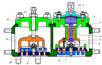 бронзовые втулки 6. Съемная крышка 15 прикреплена к головке 4 четырьмя шпильками