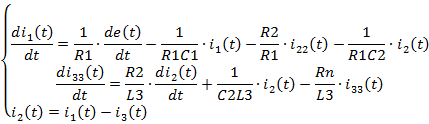 X11_n_1=(1/R1)*((EE_n_1-EE_n_2)/dt)-(1/(R1*C1))*X1_n_2-(R2/R1)*X22_n_2-(1/(R1*C2))*X2_n_2;_n_1=X33_n_2+(R2/L3)*X22_n_2*dt+(1/(C2*L3))*X2_n_2*dt-Rn/L3*X33_n_2*dt;22_n_1=X11_n_1-X33_n_1;