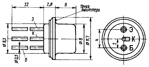 корпусом транзистора; вывод эмиттера обозначен на корпусе цветной точкой. Масса