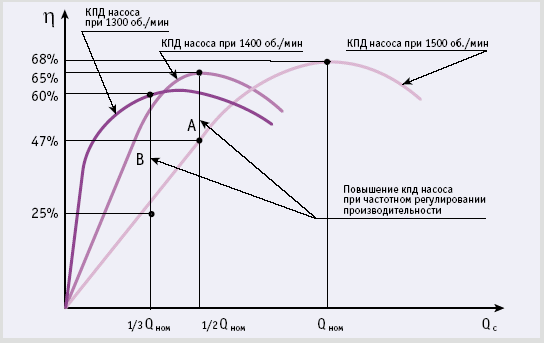 рационально работать на пониженной частоте вращения. В этом случае кпд насоса