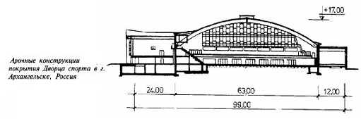 перекрыт круговыми арками пролетом 18 м, сечением 140 х 600 мм, поставленными с