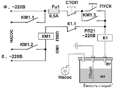 (НУ), а контактами К1.1, К1.2 отключит насос. При разборе воды из ёмкости
