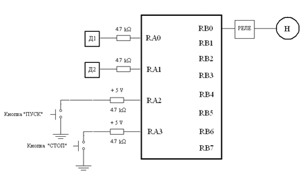 микроконтроллер, включается насос Н, при включении кнопки "СТОП" К2 -