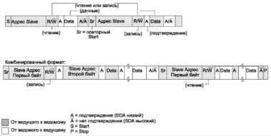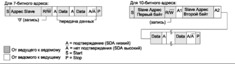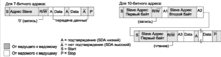 логический уровень за счет подтягивающих резисторов. Биты START и STOP формируются ведущим для