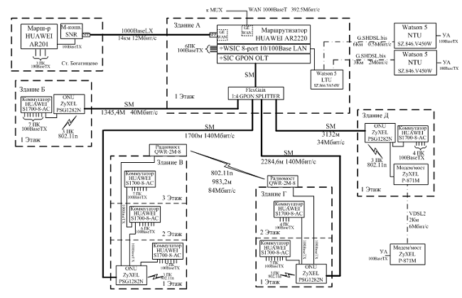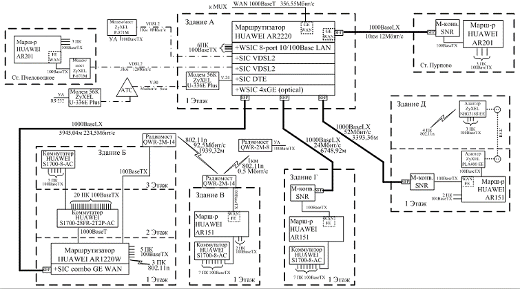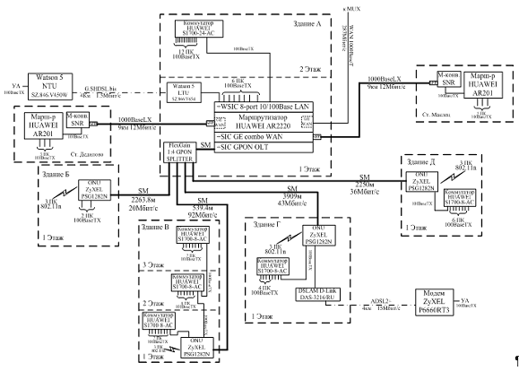 Так же сеть здания А имеет двух удаленных абонентов подключенных по технологии ADSL2+,