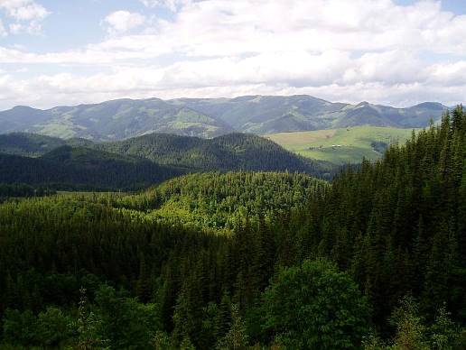 гірські хребти з пологими вершинами та лісистими схилами, мальовничі краєвиди,