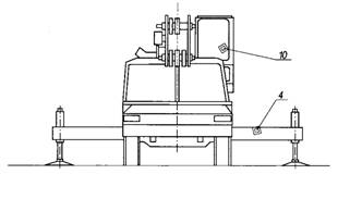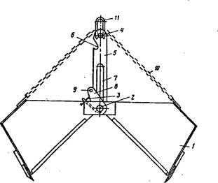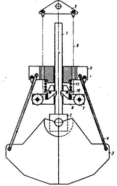 подвижную траверзу 6, крюк 9 для зацепления с осью 10 крепления челюстей 5,