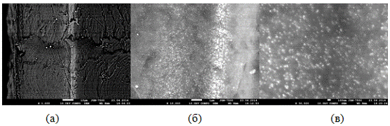 увеличении 1 000 (а), 10 000 (б), 30 000 (в)