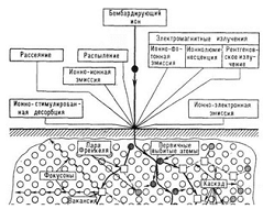 объёмное и поверхностное рассеяние бомбардирующих ионов, эмиссия из различных