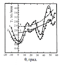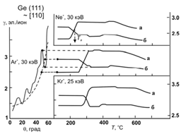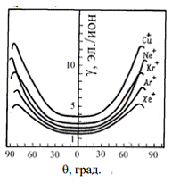 действием ионной бомбардировки. Этот процесс зависит от энергии и угла падения