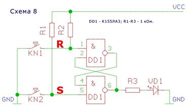 В этой схеме его состояние меняется при нажатии кнопок KN1 и KN2. Само