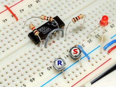 При нажатии на кнопку KN1 (вход R) светодиод выключается