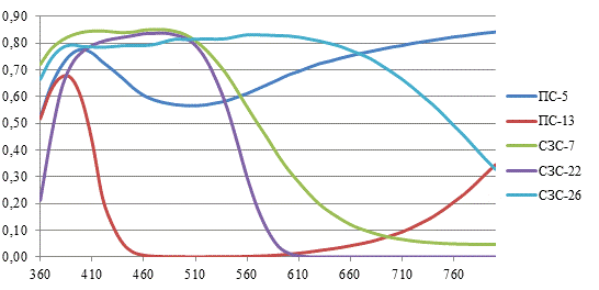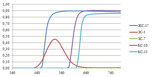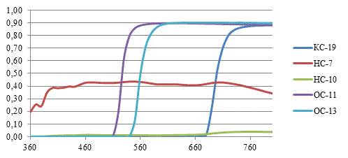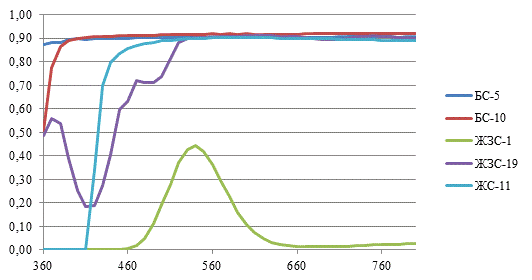 изменения пропускания стекол в зависимости от длины волны. На данном этапе