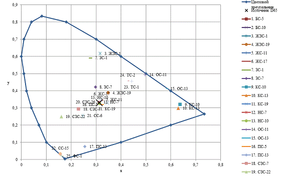 также расчет координат цветностей, доминирующей длины волны и степени