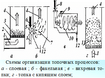 топочных процессов: а - слоевая; б - факельная; в - вихревая топки; г - топка с