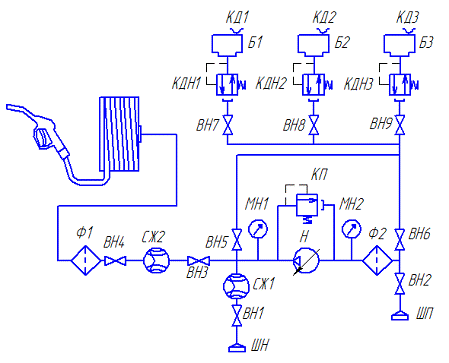 штуцер напорный; ШП - штуцер приемный; КД1-КД3 - дыхательные клапаны; Н - насос регулируемый.