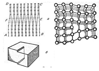Рисунок 1.2. а - краевая дислокация в кристалле