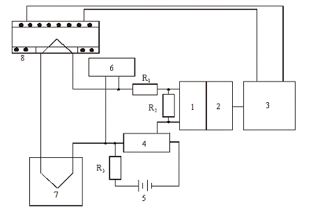 - источник питания, 6 -цифровой вольтметр Р-385, 7 - нуль-термостат, 8 - печь, R1,