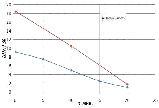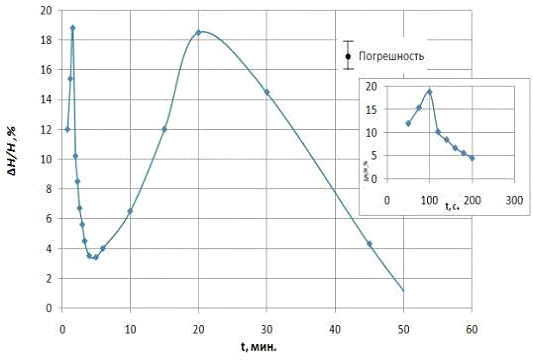 1. Зависимость относительного изменения микротвердости Si от длительности облучения светом с