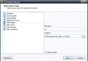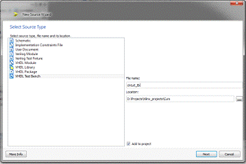 cicuit_tb.vhd для описания симуляции проекта, выбрав тип файла VHDL TestBench в