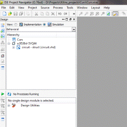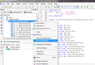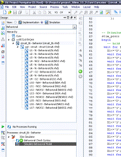 необходимо во вкладке Design, при отмеченном Simulation, выделить файл описания симуляции проекта cicuit_tb.vhd, а затем во вкладке Process запустить Simulate Behavioral Model.