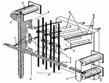 8- упор штовхач; 9- контактні пружини; 10- вертикальні контактні шини; 11-