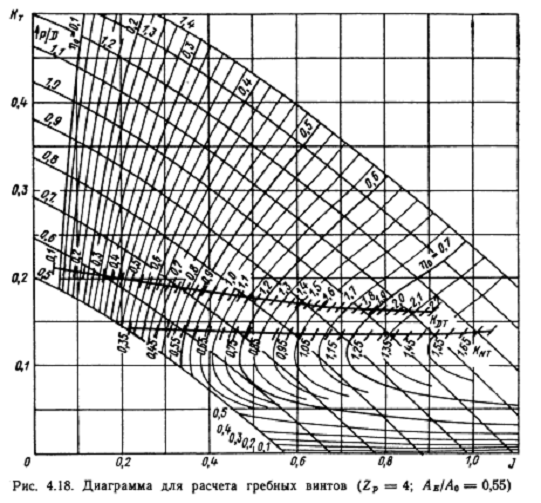 .По рисунку 4.18 определяем КПД гребного винта η0(KT,I).