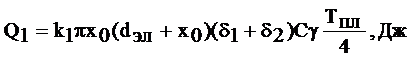 выделенного центрального столбика металла диаметром dэл 4); Qпот=Q1+ Q2+ Q3 складывается из потерь тепла на нагрев металла Q1, окружающего центральный столбик, нагрев электродов Q2 и потерь от лучеиспускания с поверхностей свариваемых деталей Q3.
