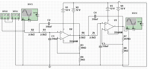 Рис 2. Схема фильтра Баттерворта в программе Multisim