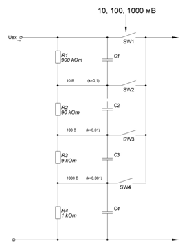 Деление входного напряжения прибора в области частот до десятков килогерц