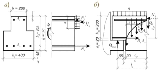 резко меняются размеры сечения ригеля, т.е. в углу подрезки (рис. 2, б). Высота