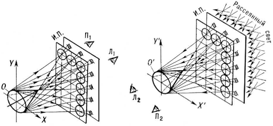 (интегрального) изображения O1; П1, Л1 и П2 Л2 - положение правого и левого