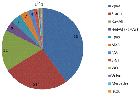 автомобилей), ГАЗ (4 автомобиля), ЗИЛ (3 автомобиля), УАЗ (1 автомобиль), Volvo (1 автомобиль), Mercedes (1 автомобиль) и Isuzu (1 автомобиль).