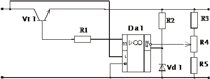сравнивается с опорным напряжением. Выход ОУ подключен к базе VT1, включенного