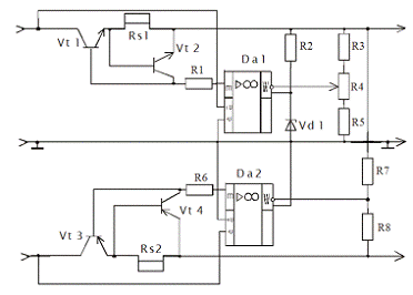 В номинальном режиме потенциал средней точки делителя R7 - R8 будет равен потенциалу общей шины, т.е. 0. Т. о., UДИФ2 = U02 = 0. При уменьшении отрицательного UВЫХ2 потенциал инвертирующего входа DA2 становится положительным. Это напряжение усиливается и
