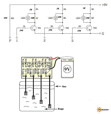 датчика замыкаются водой. Вследствие замыкания электрической цепи, ток проходит