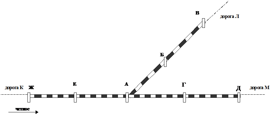 стыки Ж, В, Д с соседними дорогами К, Л, М.
