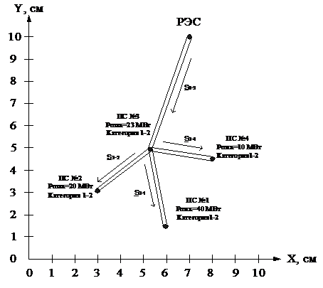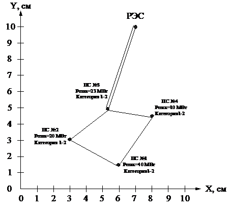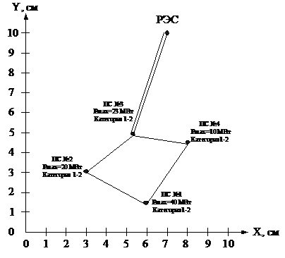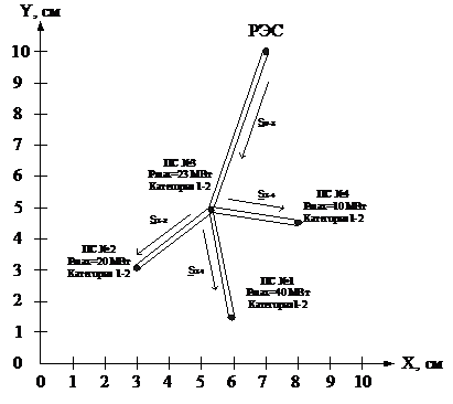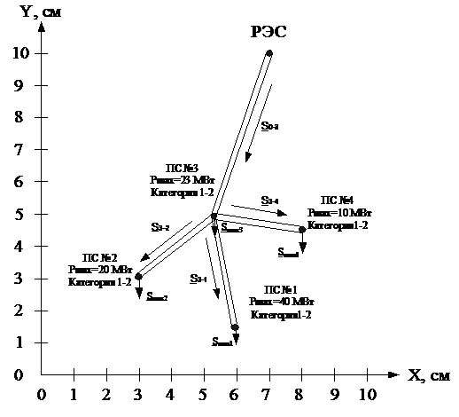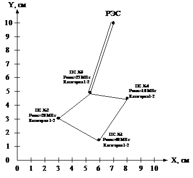Расположение потребителей и источника питания на координатной плоскости,
