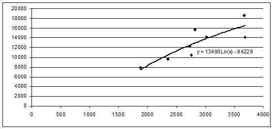 была выявлена логарифмическая взаимосвязь между стоимостью экспорта и объемом