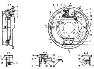 Тормозные механизмы задних колес (рис. 23) колодочные,