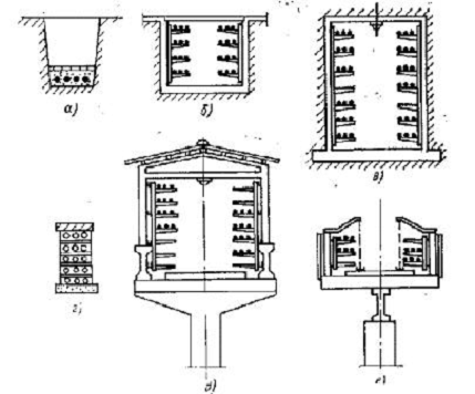 а) траншея; б) канал; в) туннель; г) блок; д) галерея; е)