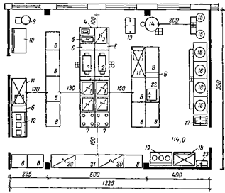 холодильный ШХ-0,4М; 19 - прилавок-мармит для первых блюд