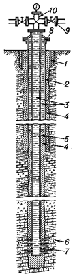 перфорированные отверстия; 8 - колонная головка; 9 - задвижки; 10 - крестовина.