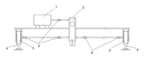 1- електродвигун; 2- редуктор; 3- колеса; 4- рейки; 5- муфти
