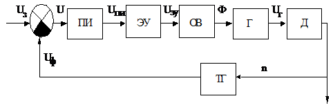 генератора. С двигателя сигнал передается на элемент 6 (тахогенератор) и он