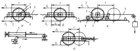 Рис. 2 - Схемы натяжных устройств: а, б - винтовые; в - тележечное