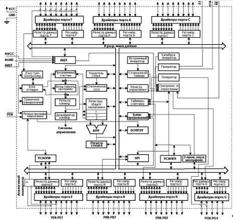 AVR-микроконтроллер; развитая RISC-архитектура - 133 мощных инструкций,