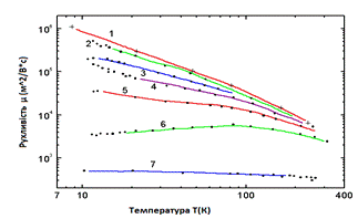 Рис. 1.5 Рухливість електронів в залежності від температури