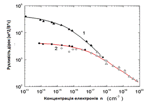 1) майже вдвічі перевищує рухливість дірок (Рис.1.6, Рис.1.7). Однак при зміні
