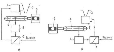 действия с регулированием высоты слоя материала на ленте (а) и скорости потока